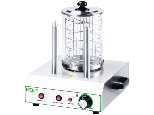 CUOCI HOTDOG YKK02A Macchina per riscaldare e cuocere panini e würstel. Struttura in acciaioinox - 2 punzoni per riscaldare il pane - termostato - campana in vetro con all’interno cestello...
