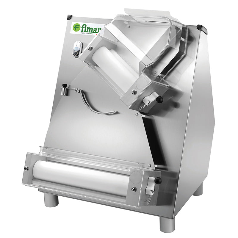 Macchina per stendere impasti di pizza, pane, piada, focacce, ecc. Struttura interamente in acciaio inox AISI 304 – rulli in resina alimentare – leva di regolazione spessore su entrambi i gruppi – apertura rulli da 0,3 mm a max 5,5 mm – rulli superiori inclinati FI32N per realizzare diverse forme. Il sistema con micro di sicurezza si trova sul coperchio protezione rulli superiori e permette il funzionamento solo a coperchio chiuso.